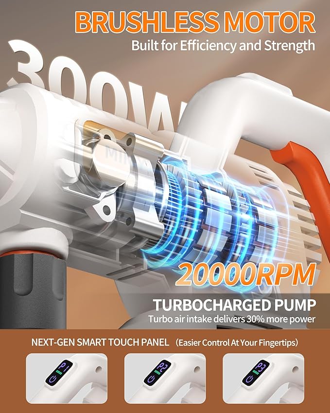 - StormForce 1200 PSI Brushless Motor: Driven by an upgraded 3820 pure-copper brushless motor, this 400 W cordless car wash portable pressure washer delivers 1200 PSI —over ten times the pressure of a standard hose. The integrated LCD control panel of our battery pressure washer cordless offers three precisely calibrated modes, letting you dial in gentle rinse or deep-scrub force on demand, dealing with everything from windows, cars, to bricks.