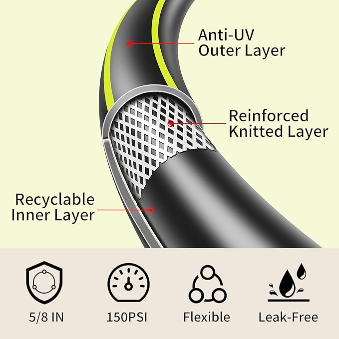 • LIGHTWEIGHT: Our garden water hose is crafted from a unique blend of rubber and polymer, making the garden hose heavy duty use. Coils easily and portable move round the yard.