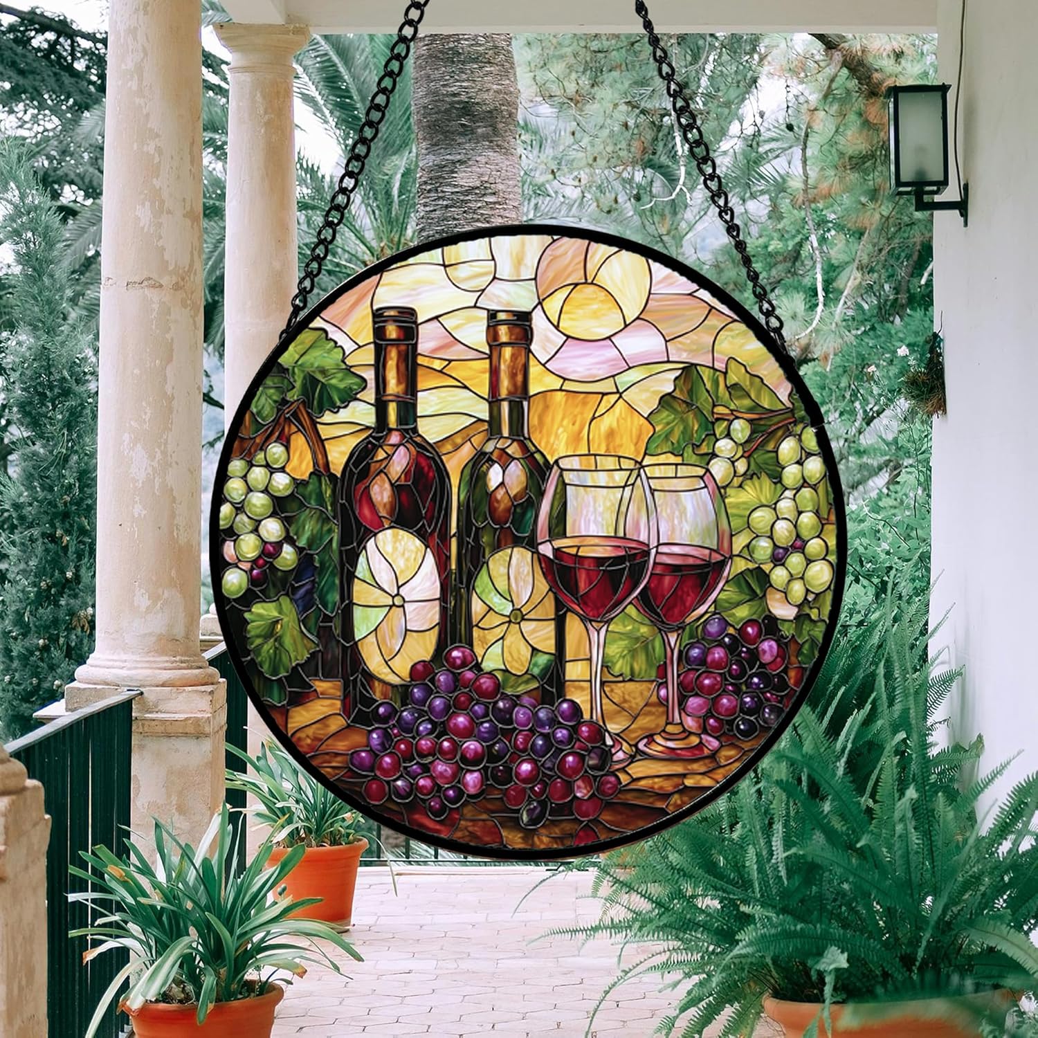 Stained Glass Window Hanging, Grapes and Wine Suncatcher Diamond Glass Panel Hangings Sun Catchers Decor for Birthday for Women, Men, Wife, Aunt, and Mom 14.9x14.9 in