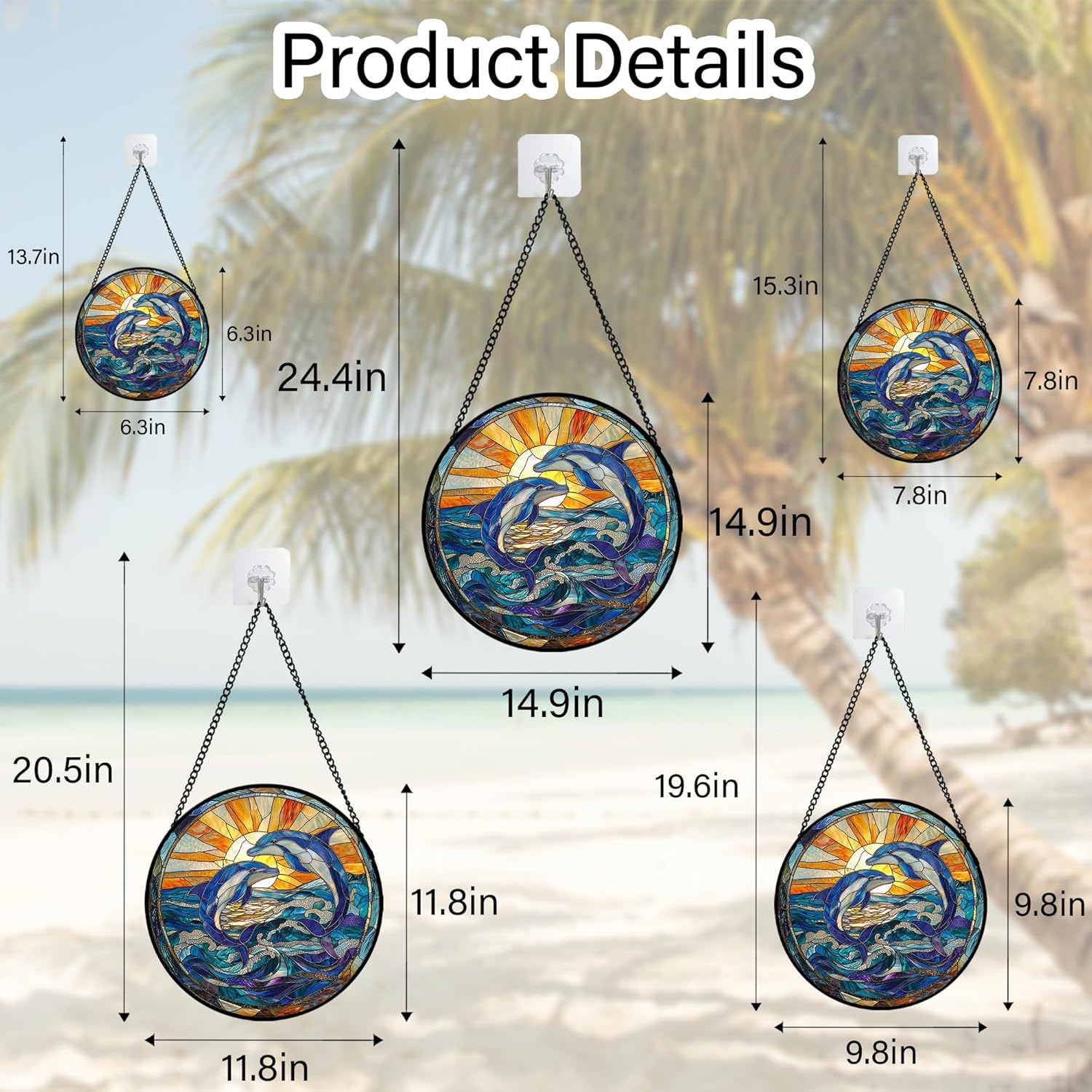 Stained Glass Window Hanging, Blue Dolphin Sun Catchers Colorful Glass Panel Sunrise Sea View Suncatcher Decor for Birthday for Women, Men, Wife, Aunt, and Mom 14.9x14.9 in