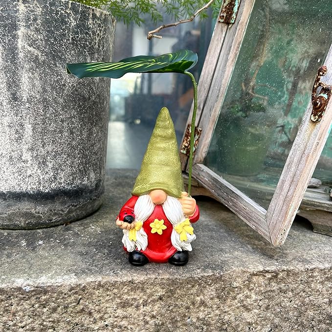 • DESIGN FEATURES: Charming garden gnome figurine wearing a red outfit with yellow flower accents, topped with a distinctive green pointed hat