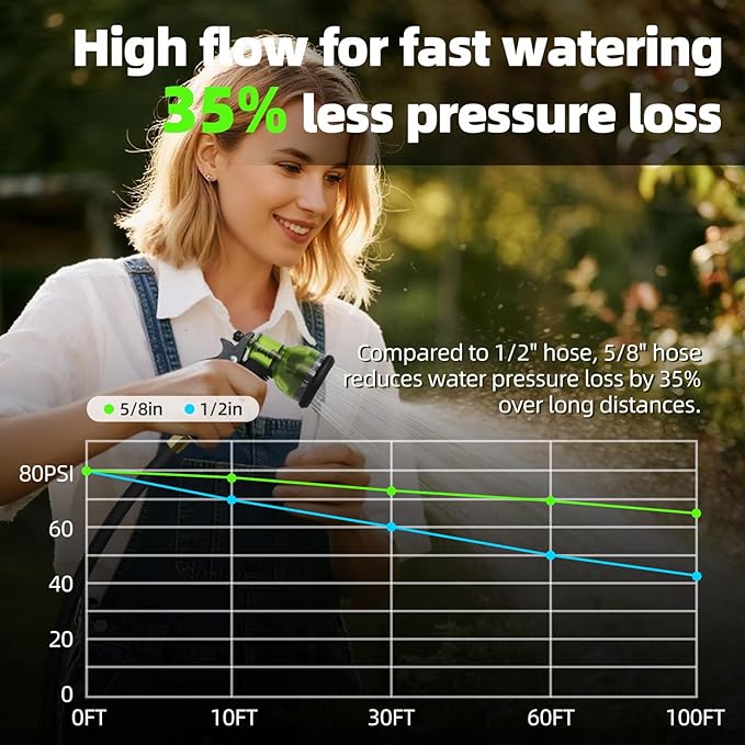 • 【High-flow irrigation engine & 80 minutes of time-saving efficiency】Versus 1/2-inch hoses, this retractable garden hose reel's 5/8-inch hose reduces long-distance pressure loss by 35%. Saves 80 minutes irrigating basketball court-sized areas – perfect for large tasks. The garden hose reel uses 3-layer PVC + fiber-braided construction tested at 360 PSI burst pressure.