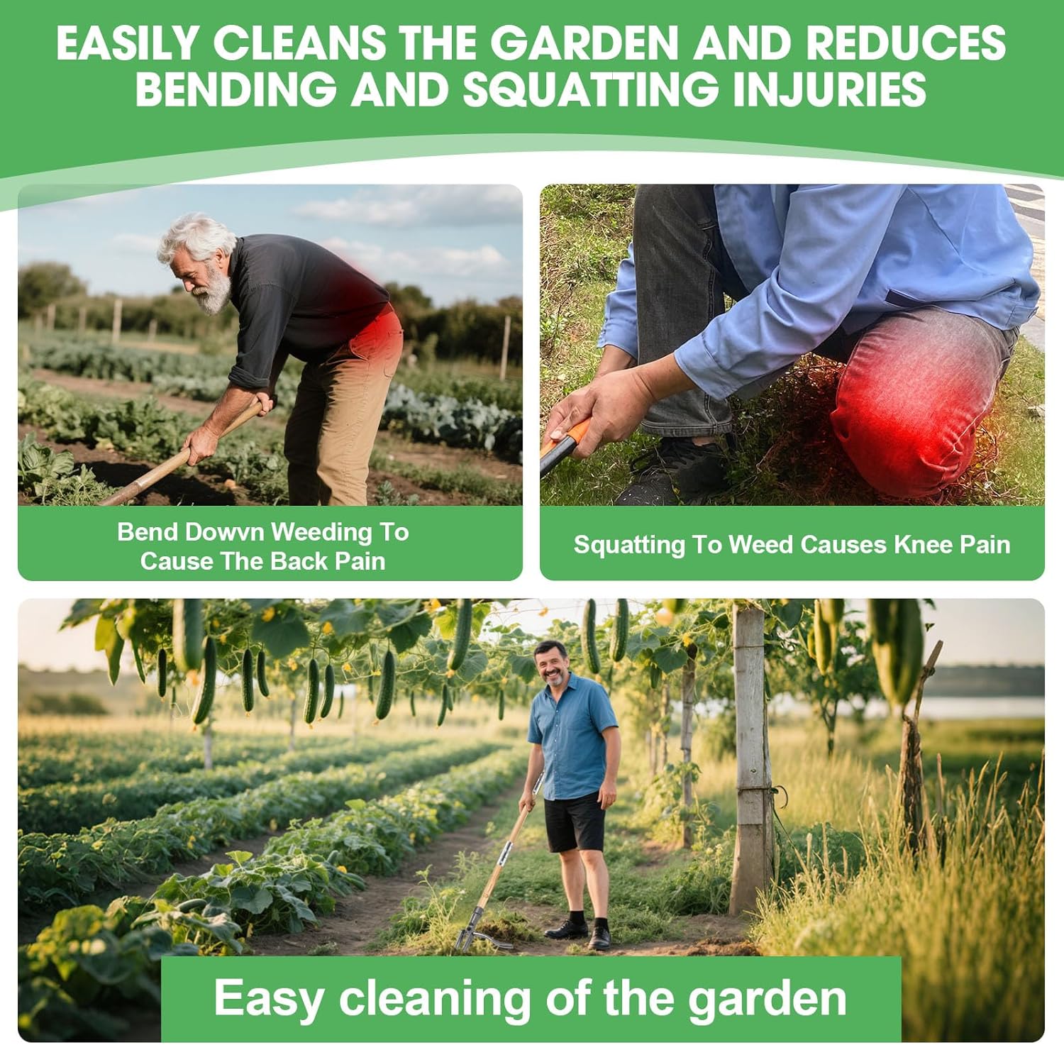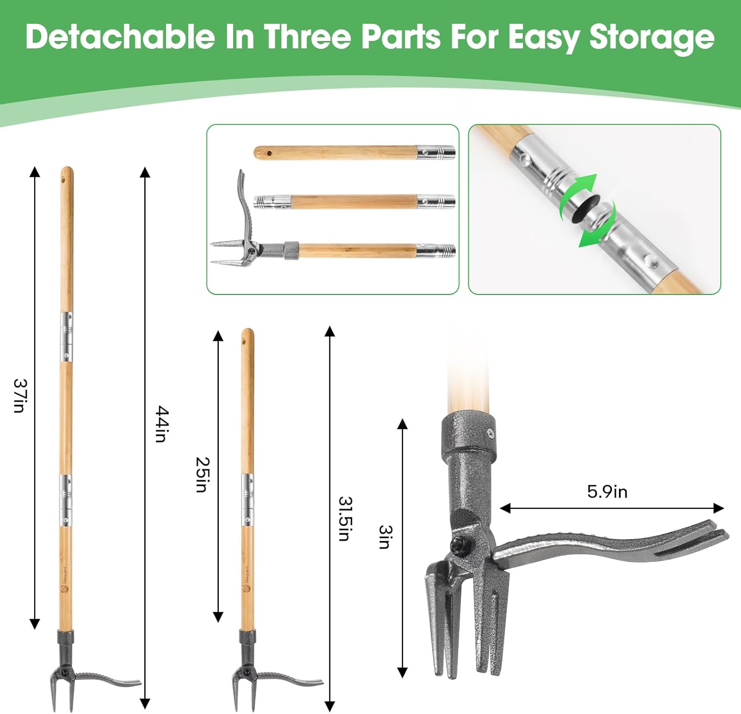 • Adjustable & Space-Saving:Split the handle into 3 sections for compact storage (31.5" shortest length) or adjust for user height. The built-in hanging hole keeps your garden weeder neatly stored—ideal for small sheds or garages