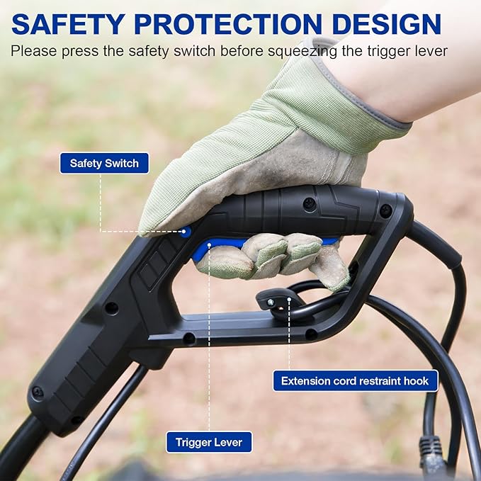 • High-Performance Motor: This corded tiller with a 14A motor achieves speeds of up to 19,000 RPM, efficiently tilling soil that is 18" wide and 8" deep.