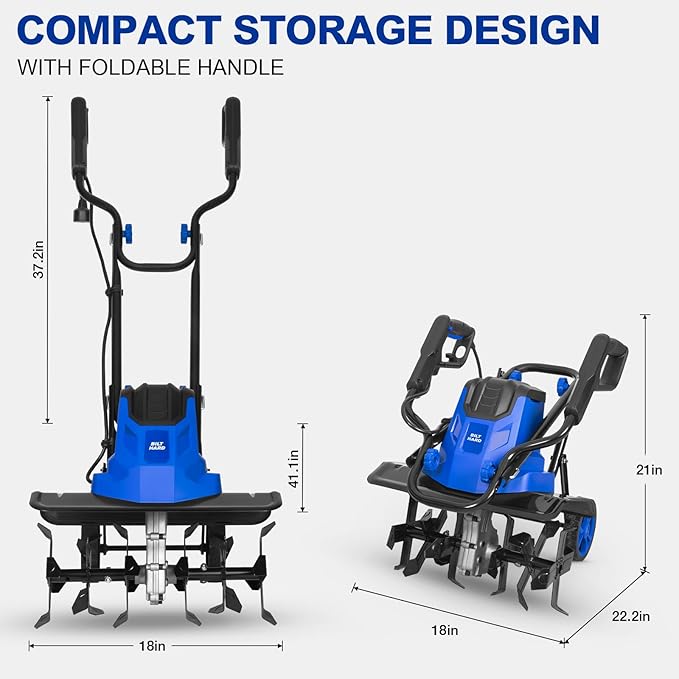 • Foldable and Portable: Weighing only 23.48 lbs, the tiller is lightweight and easy to transport. Equipped with 4 quick knobs and an H-handle, it is designed for convenient storage.