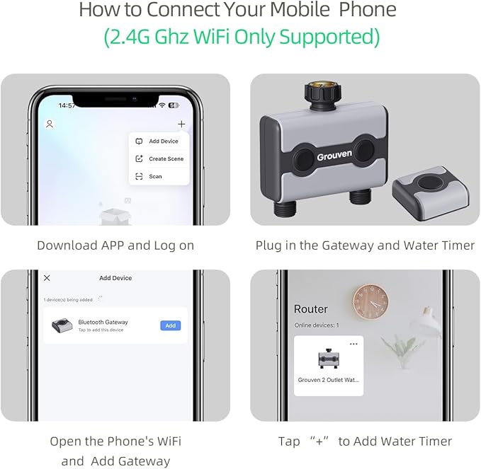 • Seamless APP Control via 2.4Ghz WiFi & Bluetooth | Take full control of your garden watering from anywhere! The Grouven smart hose faucet timer connects effortlessly to your smartphone via 2.4Ghz WiFi or Bluetooth, allowing you to manage watering schedules, adjust settings, and monitor your garden remotely. Perfect for busy homeowners or frequent travelers.
