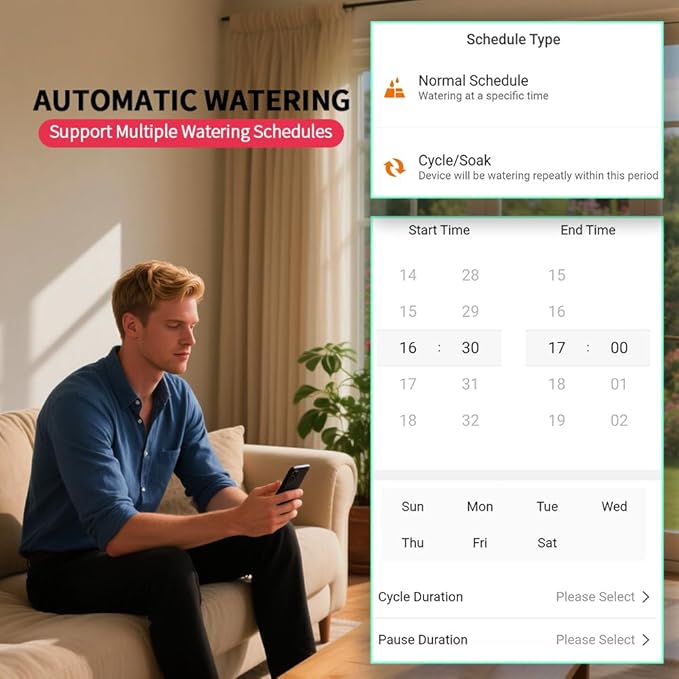 • 2 Irrigation Modes: Under normal schedule, the hose timer runs on its own and water at a specific time. Customize its start time, irrigation duration, and weekly watering days to meet your different watering needs. In the cycle/soak watering mode, the faucet timer will automatically cycle watering within the preset start and end times. When watering schedules are set, the irrigation timer will take over control of the lawn and garden.