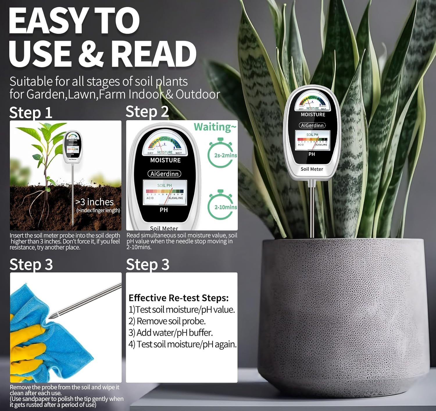 • Notes & Worry-Free Service: The 2in1 moisture meter for plants can only measure the moisture and testing pH of the SOIL, please don't test in water/any liquid. AiGerdinn provides a 365-day warranty and 24-hour friendly customer service. Please feel free to contact us if you have any issues with the 2-in-1 soil meter. We will do our best to correct the wrong, give you the best solutions, which can save your time waiting for processing progress.
