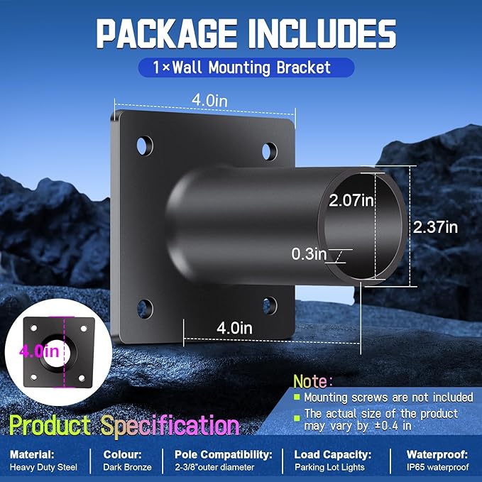 • Perfect Size: This Dark bronze 4x4-inch square metal plate mounting tenon bracket is specifically designed for slip fitter lights with a diameter of 2 3/8 inches, allowing your outdoor lighting fixtures to be installed horizontally or vertically. (Please ensure precise measurements to avoid loosening due to product mismatch.)