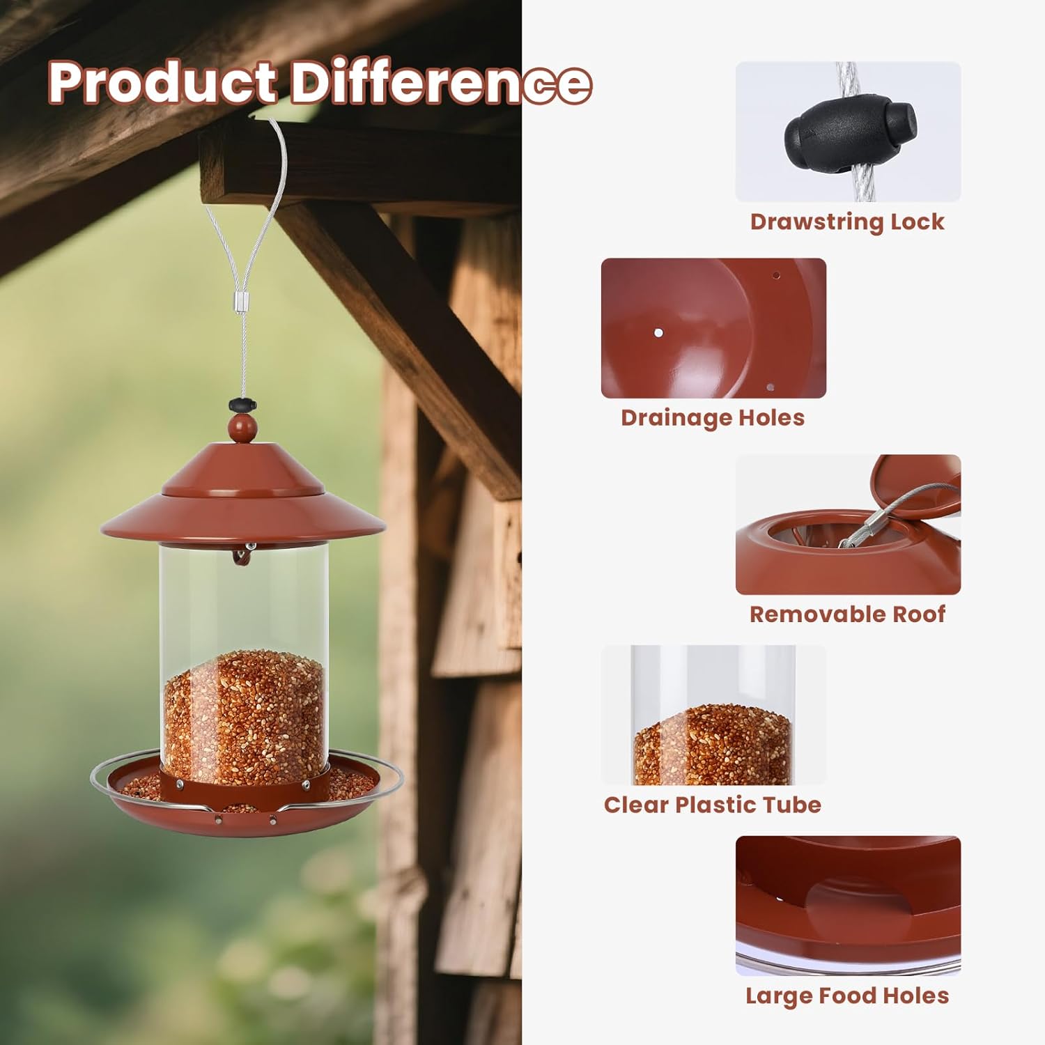 • 【Easy to Refill & Clean】: The detachable roof and compact opening make this small bird feeder easy to fill with seeds. Cleaning is also very simple, just remove the cover and rinse with water directly! Works with most bird feeder hangers for outside, making it a reliable option for bird feeders for outdoors hanging feeders.
