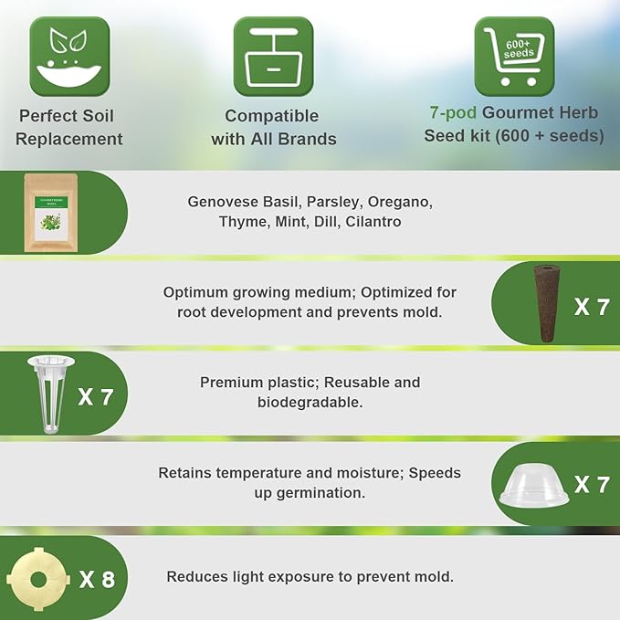 Gourmet Herbs Seed Pod Kit for AeroGarden, iDoo, Ahopegarden, MUFGA Hydroponics Garden with Basil, Parsley, Thyme, Mint, Cilantro, Dill, Oregano - Compatible with All Hydroponics (7-Pod)