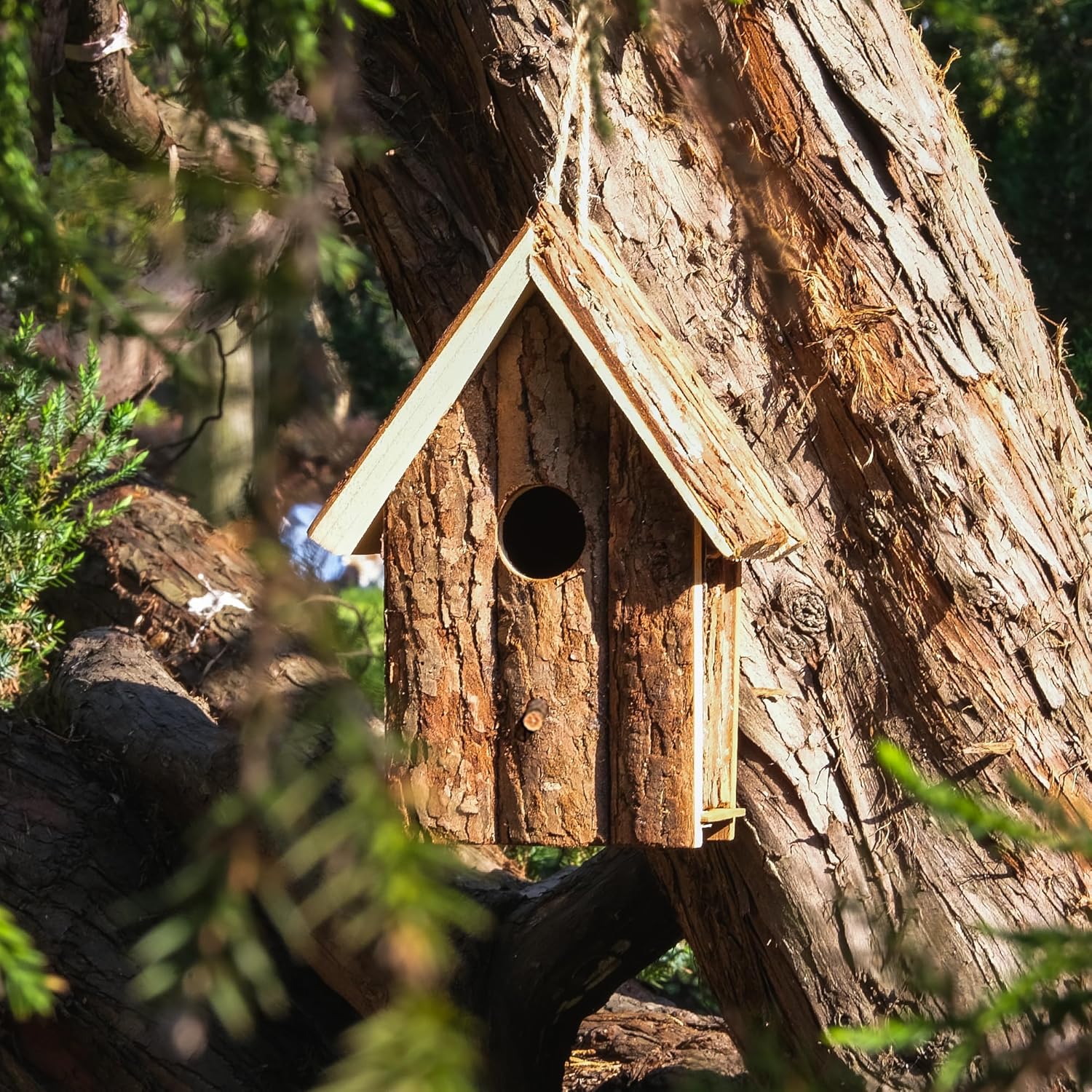 Natural Wooden Bird House for Outdoors – Handcrafted Bark Design, Weatherproof Roof, Perfect for Small Birds, Finch, Bluebird, Wrens & Chickadees, Ideal for Gardens, Patios, and Backyards