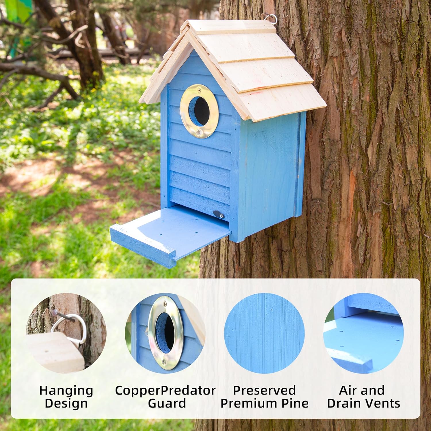• Premium Material: Crafted from New Zealand pine, this wood birdhouse is made from naturally sourced wood, and features a polished finish with weather-resistant coatings (colored roofs: waterproof paint; natural roof: clear varnish)