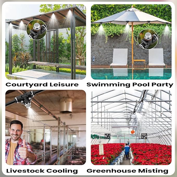 • 【Ideal for Multiple Uses】Designed for outdoor misting cooling system.Perfect for cooling off during hot summer days, whether you're lounging by the pool, enjoying time with your pets, or simply relaxing in your backyard