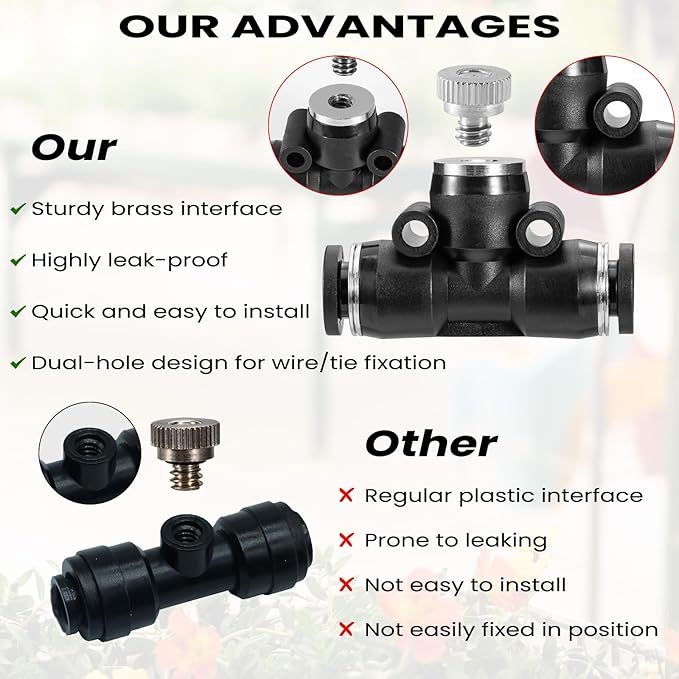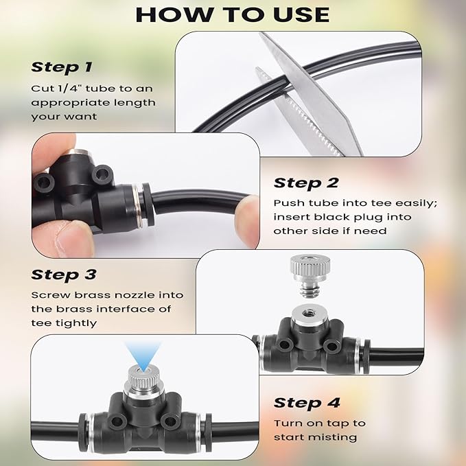 • 【Quick Installation and Leak-proof】Easy to install without any additional tools.Push the tube onto the tee ends and tighten the nozzles or plugs.Design of sliding lock increases tightness,providing lasting and a secure leak-proof connection for cooling system.When you want to turn off the mist,you can use a plug to stop misting