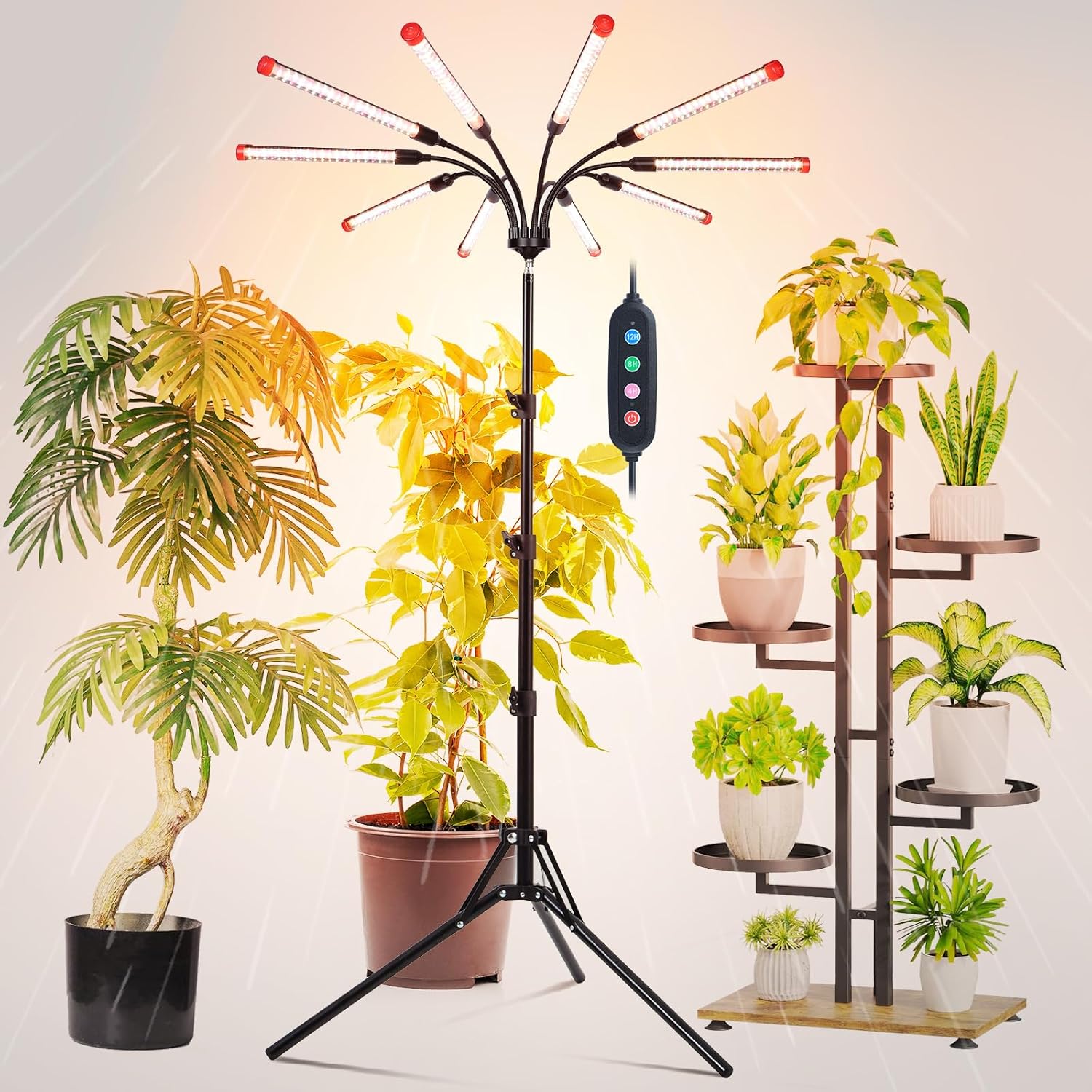 10Head Grow Lights for Indoor Plants, Seed Starting, Vegetables, Bonsai with Tripod Stand and Auto On/Off Timer 4/8/12H, 90W Power Full Spectrum Standing LED Plant Growing Lamps, 360° Gooseneck