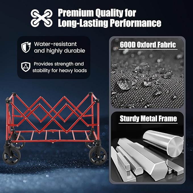• 【One Cart, Endless Uses】Whether it’s a beach day, camping trip, or post-game grocery run, this garden wagon does the heavy lifting for you. No more juggling bags, overstuffed backpacks, or repeated trips to the car — the foldable design and smooth-rolling wheels make transport effortless across sand, grass, or pavement—a smart solution for anyone who needs a foldable wagon on the go.