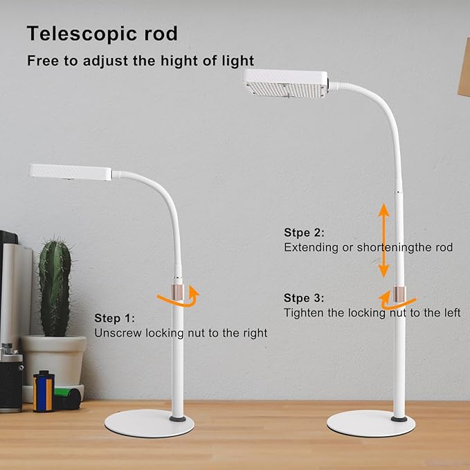 • 【Stable Base and Adjustable Height Stand】This desk grow light with base and stand, you can stand it on desk and adjust the lamp head height according to your application from 16” to 24”.
