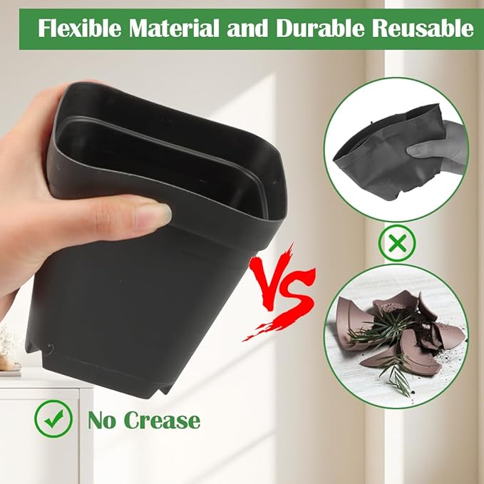 • 【High Quality Material】Our 4 inch square nursery pots with tray, is made of high quality new material, BPA free, with high toughness, not easily deformed, good thickness and easy to transplant. Added anti-aging factor, long life, reusable. When you're using the square box, don't worry about it falling over.
