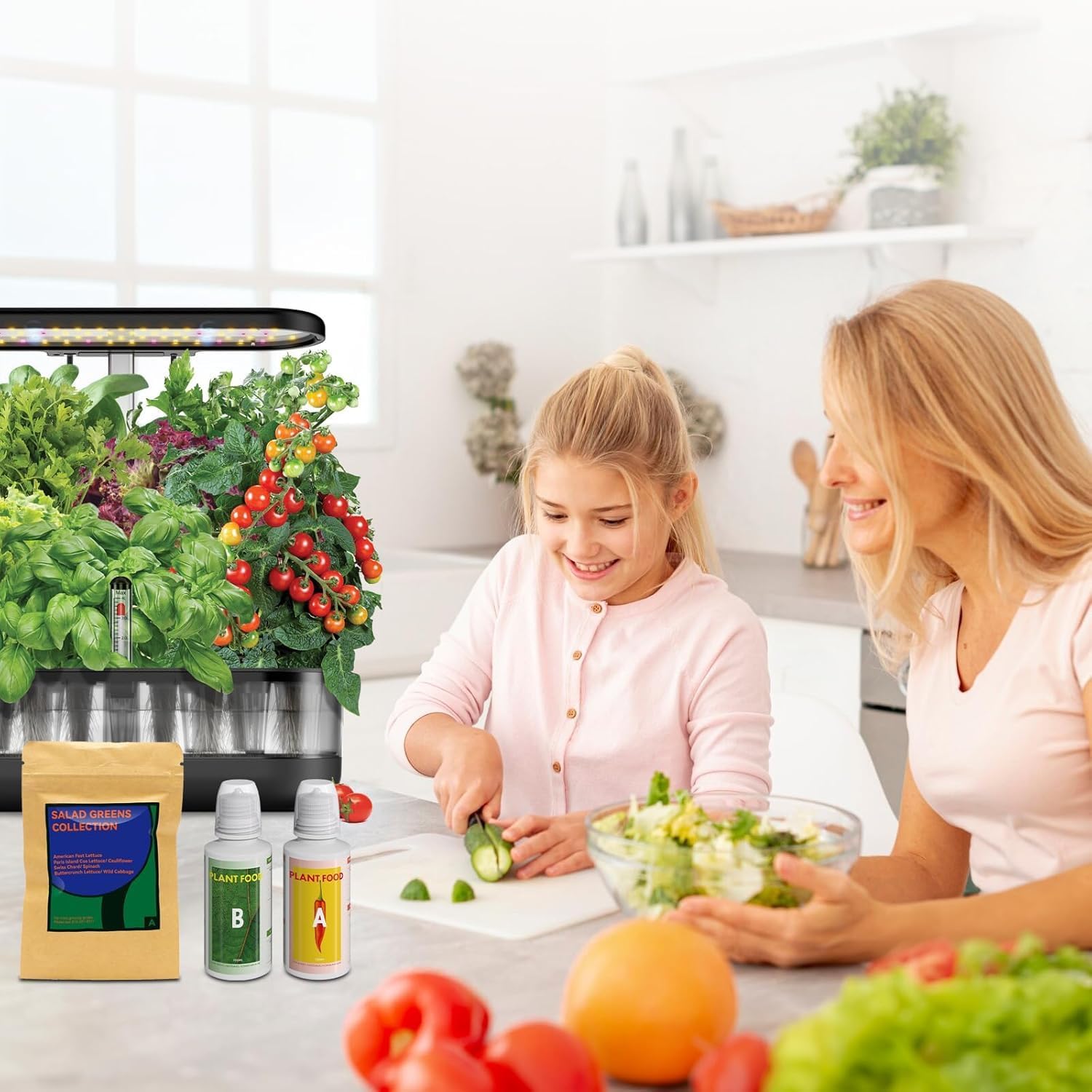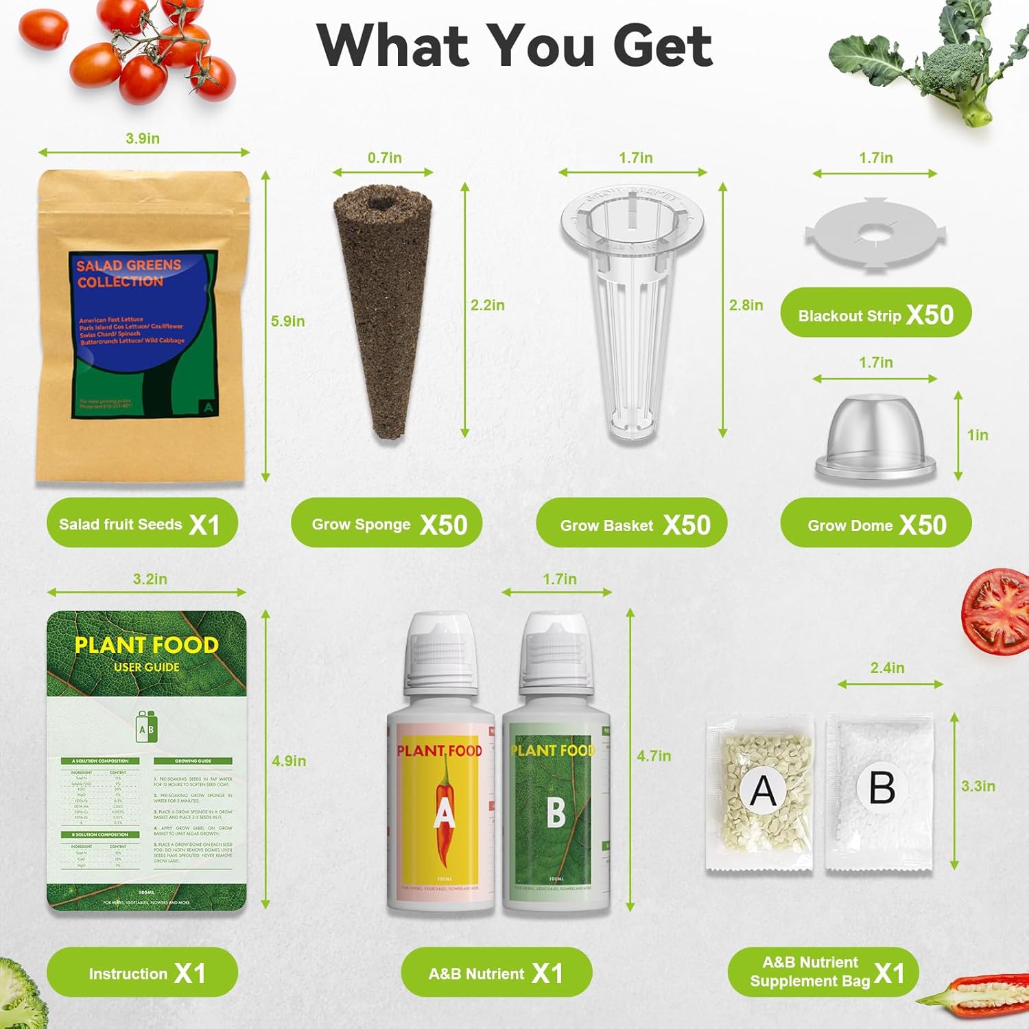 • 【All-IN-ONE Home Garden】These hydroponic pods provide everything you'll need to start your indoor herb garden. 7 types of 350+ organic salad seeds, 50 growing sponges, growing baskets, growing domes and pod labels, 200ml A&B plant food. It's suitable for both beginners and experienced gardeners