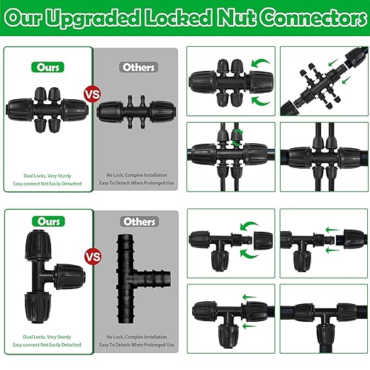 • Upgraded Quick Connect Design, Efficiency Boost: The 4-way connector, tee, and emitter of our garden drip irrigation system feature upgraded locked nut design, make them easy to connect with 1/4" irrigation tubing; what's more, the 360° tight structure of these dual locked nut ensures pipes stay firmly locked, resistant irrigation tubing loosening or detachment when dripping, sprinkling, misting, even in high-pressure water, ensure the garden irrigation system working well in any time and any place.