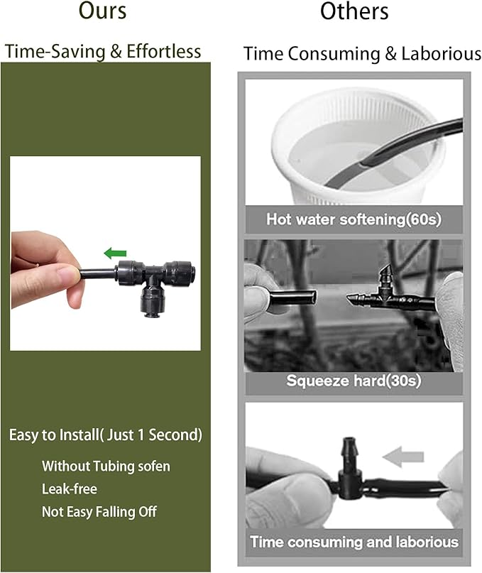 • Quick and Easy Installation : Our drip irrigation fittings makes setting up your drip irrigation a breeze with its innovative quick-connect design. Simply push 1/4 drip irrigation tubing into place for a tight, leak-free connection in seconds.