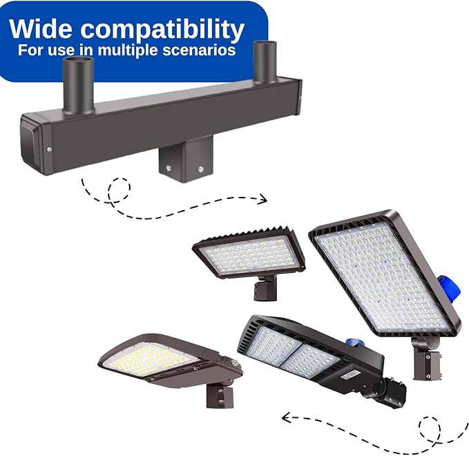 • STANDARDIZED 2-3/8" TENON ADAPTER BRACKET: Compatible with most slip fitter fixtures, eliminating the need for additional welding or modifications, enabling multi-functional use. Ideal for parking lot lights, street area lights, and shoebox lights. Suitable for use in streets, parking lots, commercial square, barn, sports field, yard, driveway, and other areas requiring large-area lighting