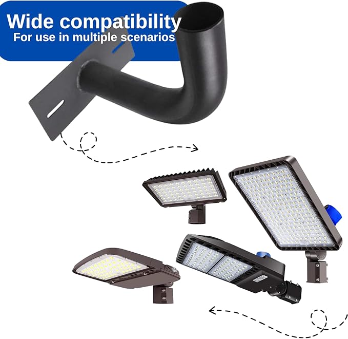 • J-shaped Wall Mount Extension Arm: The unique “J” shape design provides more precise and wider illumination of every corner of the parking lot compared to ordinary straight pole brackets, making the lighting more reasonable. The wall mounting bracket arm accessories greatly save floor space