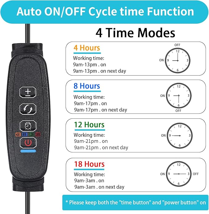 • 【Auto On/Off Timing Function】The plant grow light comes with a cycle memory timer function, which can Auto turn on/off every day according to your settings: 4/8/12/18 hours, the grow light will Auto turn on and off at the same time the next day, no manual operation is required, you can take care of your plants when you on work or vacation.