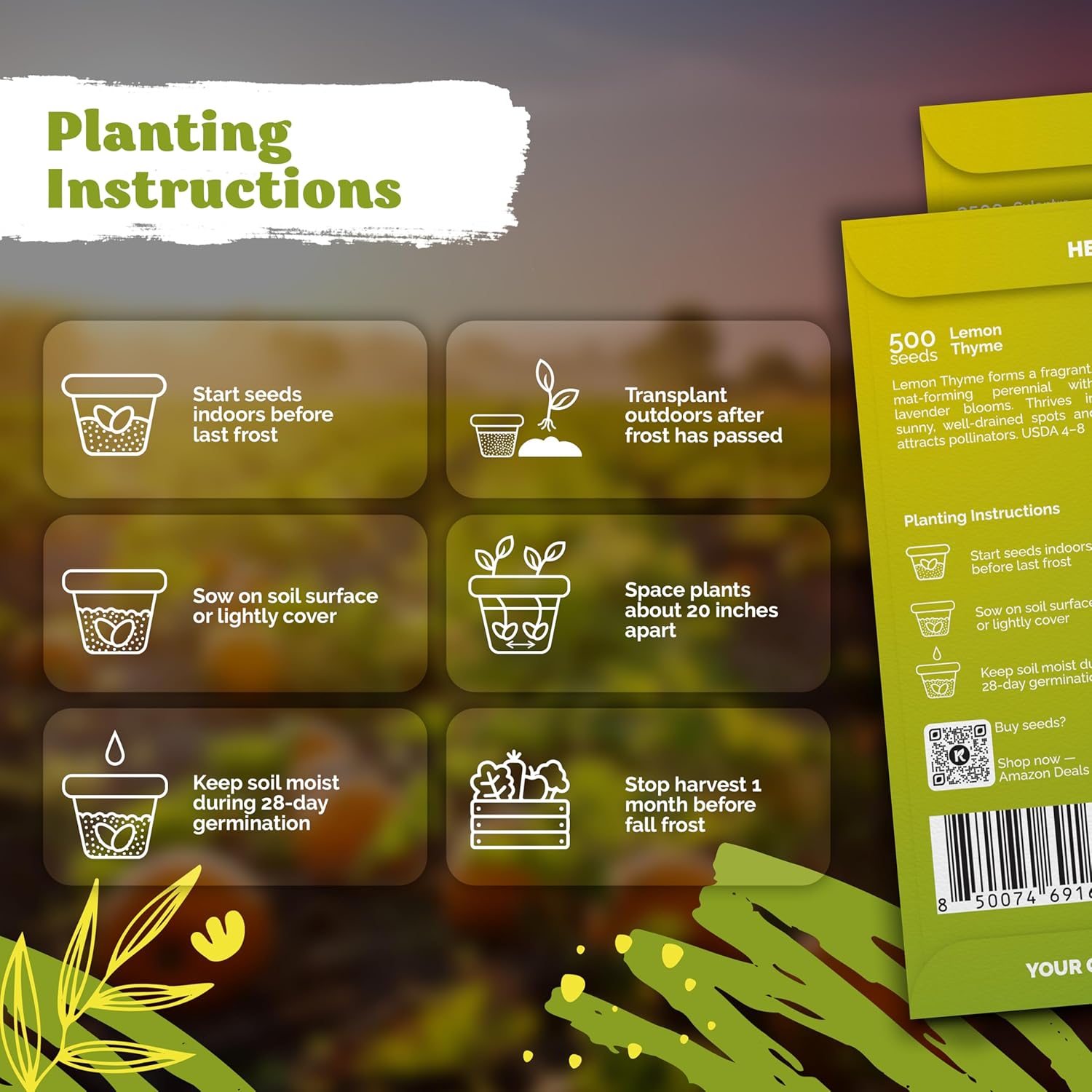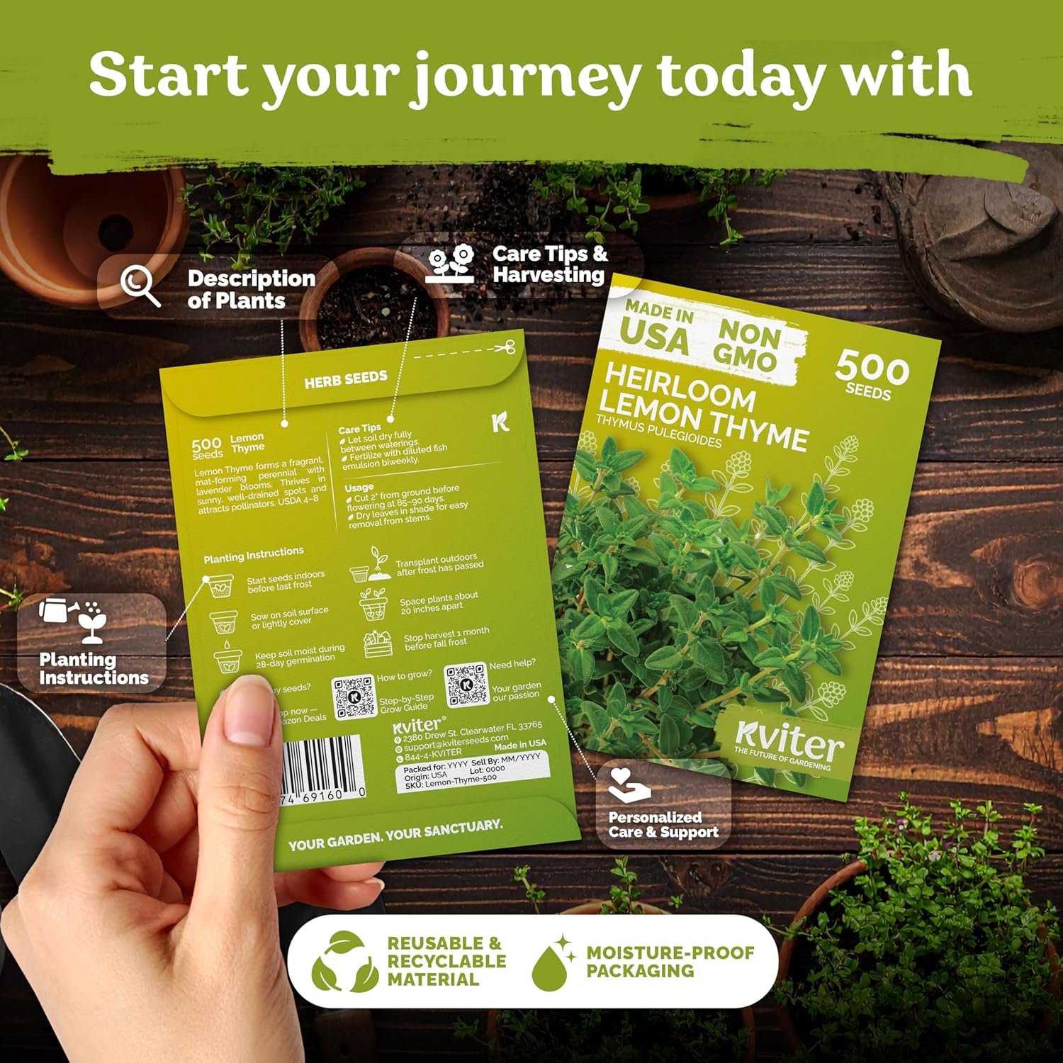 • Aromatic Flavor: Our lemon thyme seeds for planting bring a zesty twist to any kitchen garden. Germinates in 7–14 days at full sun, reaching 6–12 inches tall in USDA zones 3–10.