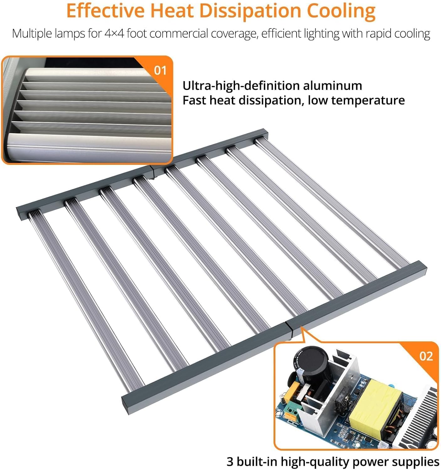 • Stable with Good Thermal Management:The 800w led grow light utilizes a passive cooling system with noiseless fans for quiet steps and longer life. Made of aluminum, the plant grow light is lightweight and safe while providing excellent thermal management and reliable steps in temperatures up to 95°F / 35°C and 90% humidity