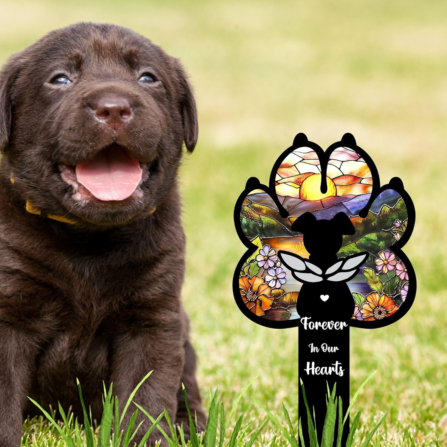 • Stunning Suncatcher-Inspired Design: This paw-shaped pet memorial plaque features a colorful stained-glass style background with a peaceful angel dog silhouette, symbolizing beauty, freedom, and eternal love.