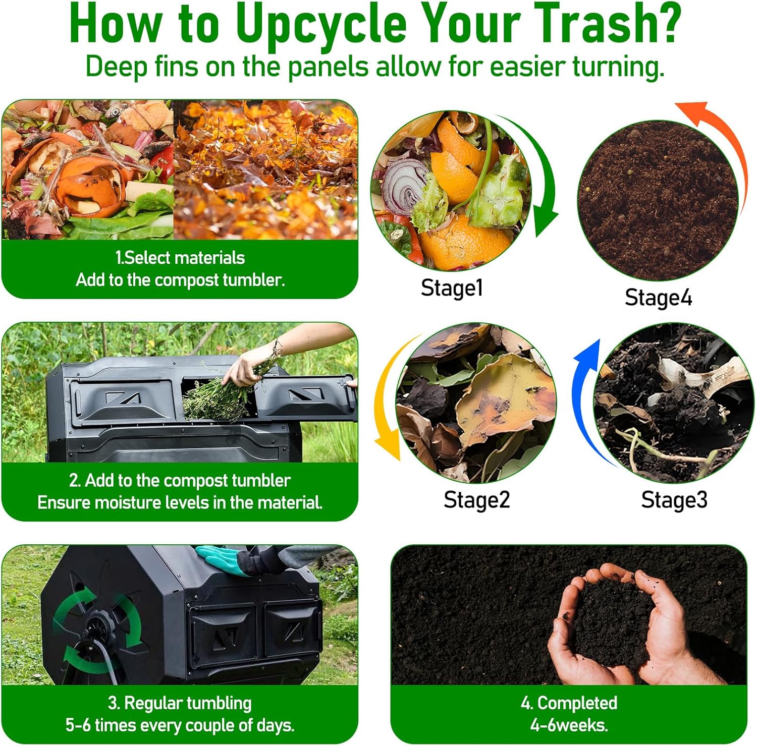 • Dual Chamber Tumbling Composter:Our innovative dual chamber compost tumbler design accelerates composting - one side matures while the other fills. This tumbling composter system creates fertile soil faster than traditional stationary compost bin outdoor options, with easy compartment switching.