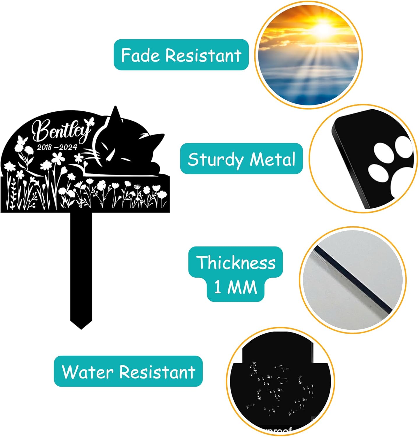 • Personalized Remembrance That Lasts – Honor your beloved cat with a custom metal grave marker, engraved with their name, years. Weather-resistant steel ensures it stands strong and beautiful in any outdoor setting.