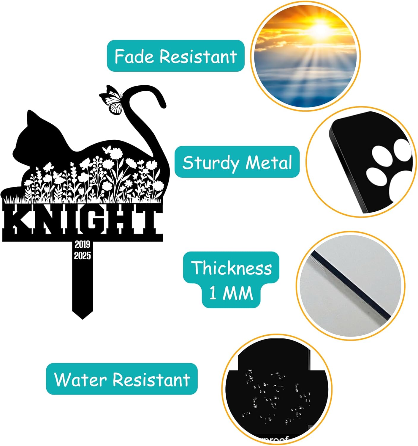 • Durable, Rust-Proof & Fade-Resistant – Our powder-coated metal grave marker is built to endure sun, rain, snow, and wind—keeping your cat’s memory safe and visible season after season.