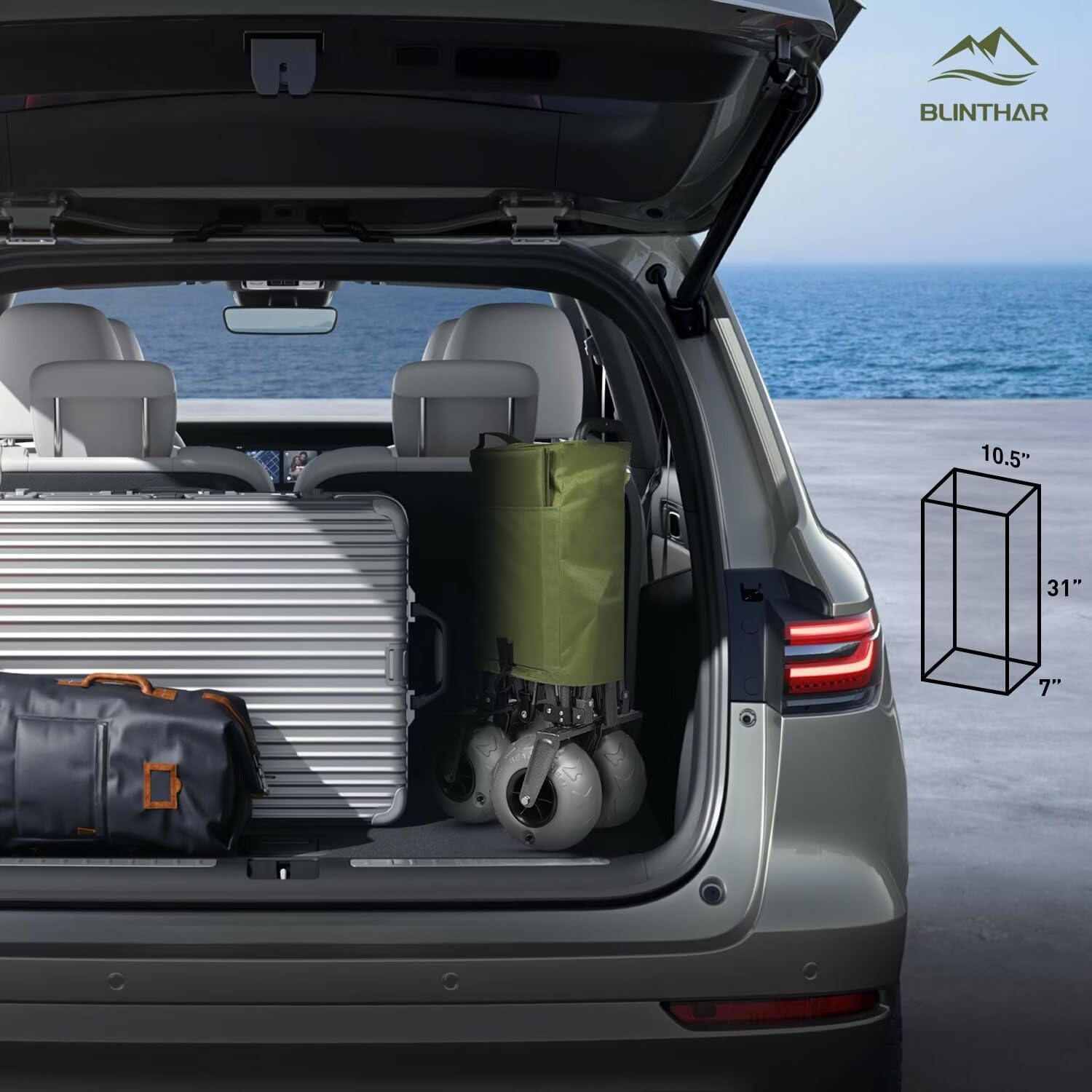 • 【Large Capacity】The BLINTHAR foldable wagon offers an expanded size of 35.4" x 19.7" x 23.6"; Balloon Wheel Size: 9" x 4"; Inner Dimensions: 35.4" x 18.1" x 13". When folded, it measures just 10.5" x 7" x 31", making it easy to fit into any car.Retractable handle telescopes up to a height of 37.5" for pulling comfort and ease of use.