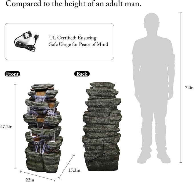 • Perfect Size: outdoor fountains with dimensions of 22"L x 15.3"W x 47.2"H, this water fountain is ideal for any outdoor setting. Plus, it comes with a 1-year manufacturer's warranty from the date of purchase.