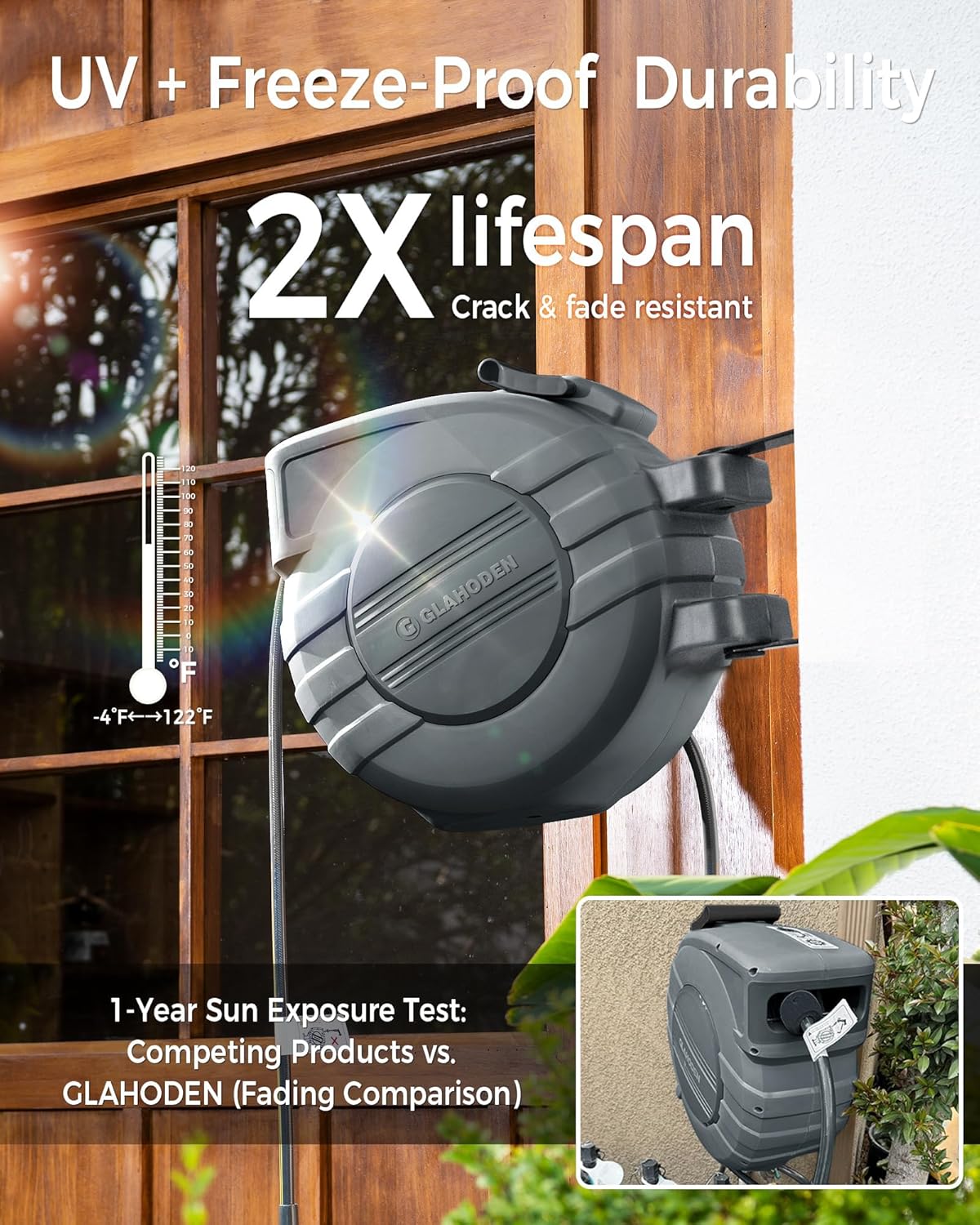 • UV + Freeze-Resistant Dual Protection: The water hose reels for outdoor use feature a UV-resistant coating, tested to withstand temperatures from -4°F to 122°F, doubling the product's lifespan. Say goodbye to cracking, fading, and weather damage—this reel is built for year-round use