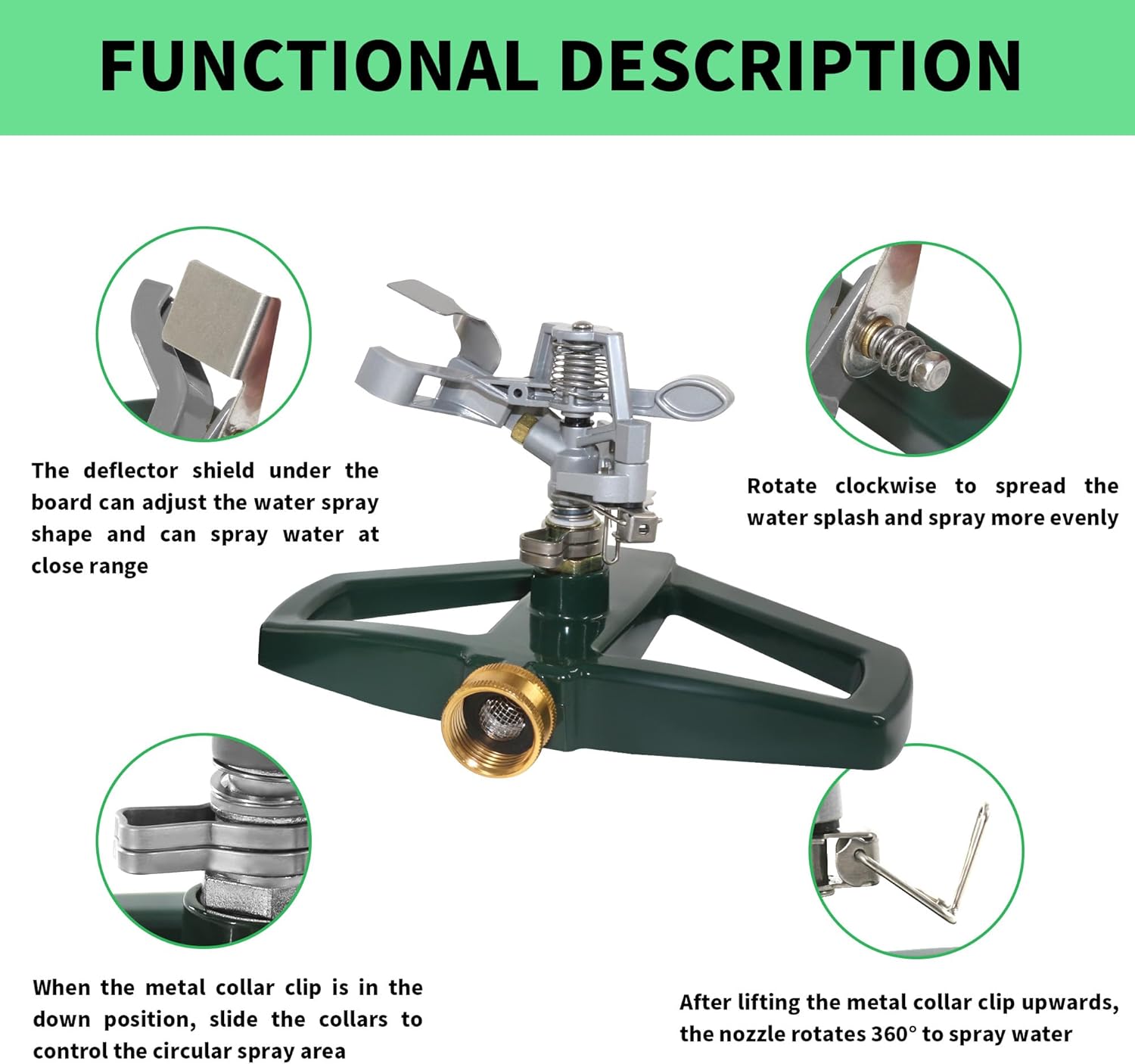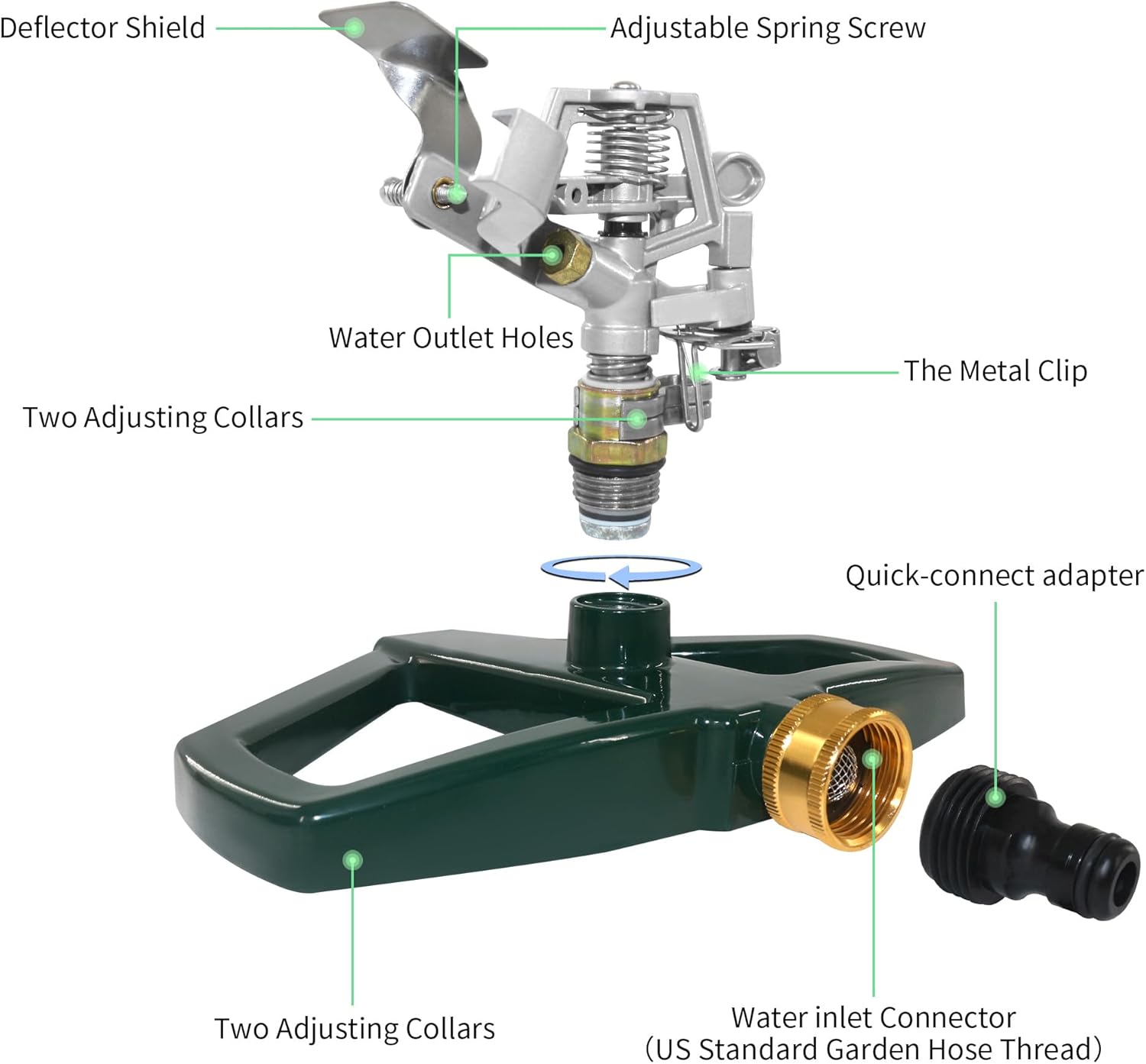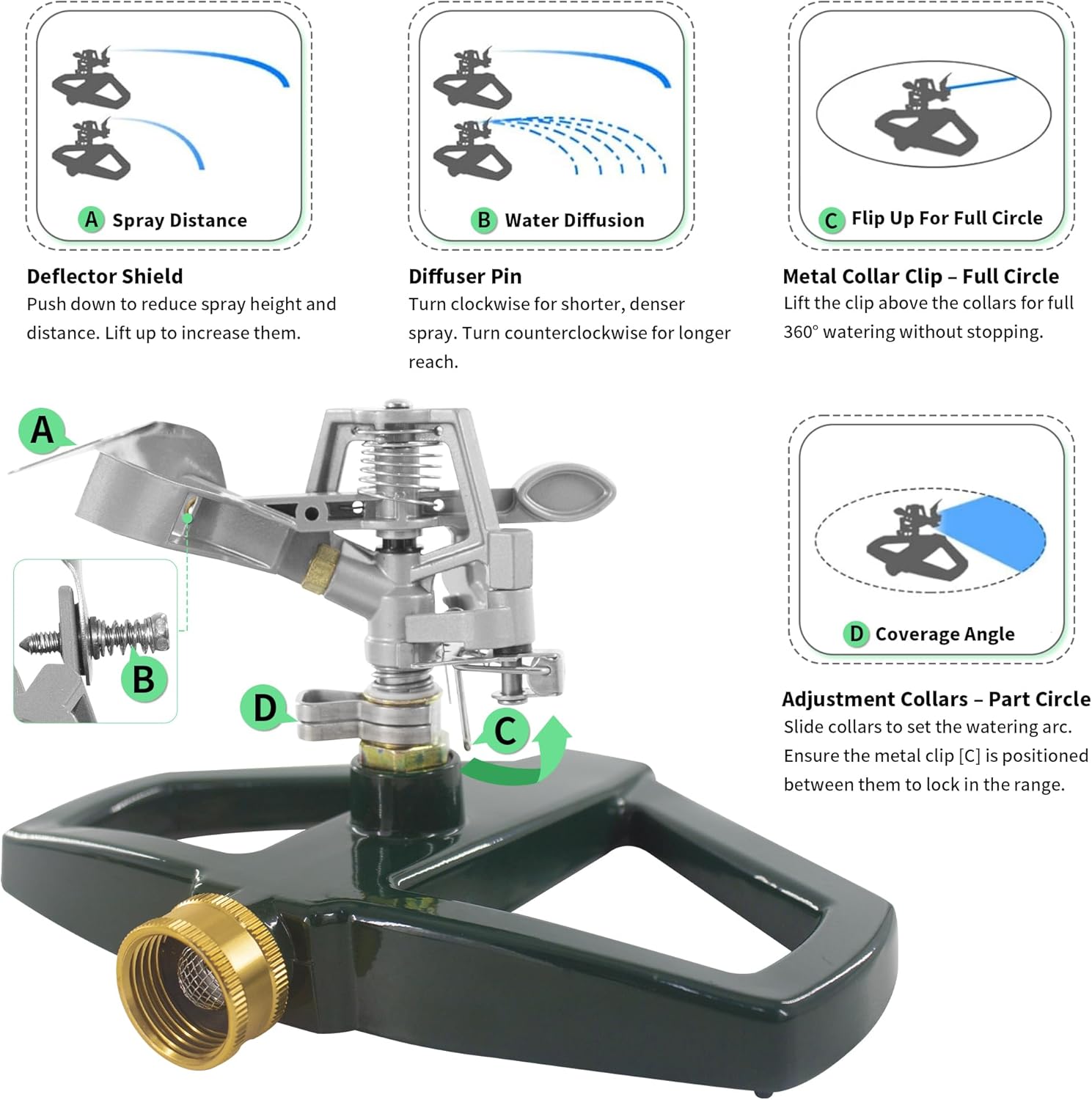 • 【Durable 100% Metal Construction for Long-Lasting Use】 Both the base and the head of our impact sprinkler are crafted from premium zinc alloy, ensuring exceptional durability and resistance to rust, corrosion, and wear. Designed to withstand harsh weather conditions and frequent use, this 100% metal sprinkler guarantees years of reliable performance, making it the perfect choice for maintaining your lawn and garden.