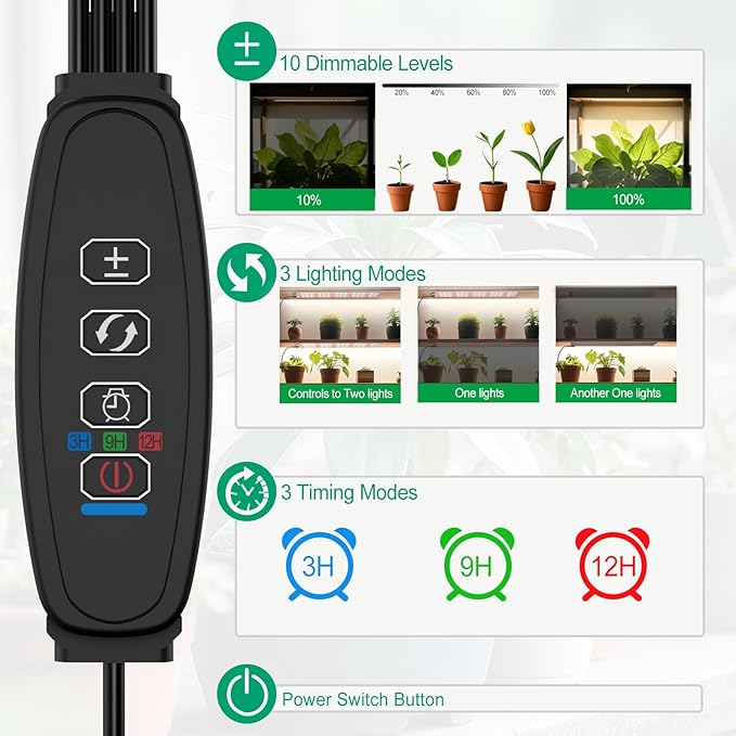 • 【3 Lighting Modes & 10 Dimmable Option】: 3 lighting modes:individual, combined, or alternate granting flexible control over light coverage. 10 dimmable options (ranging from 10% to 100%); With a range of 6000 lumens, ensure your plants receive the precise light intensity they need for improved care and growth.