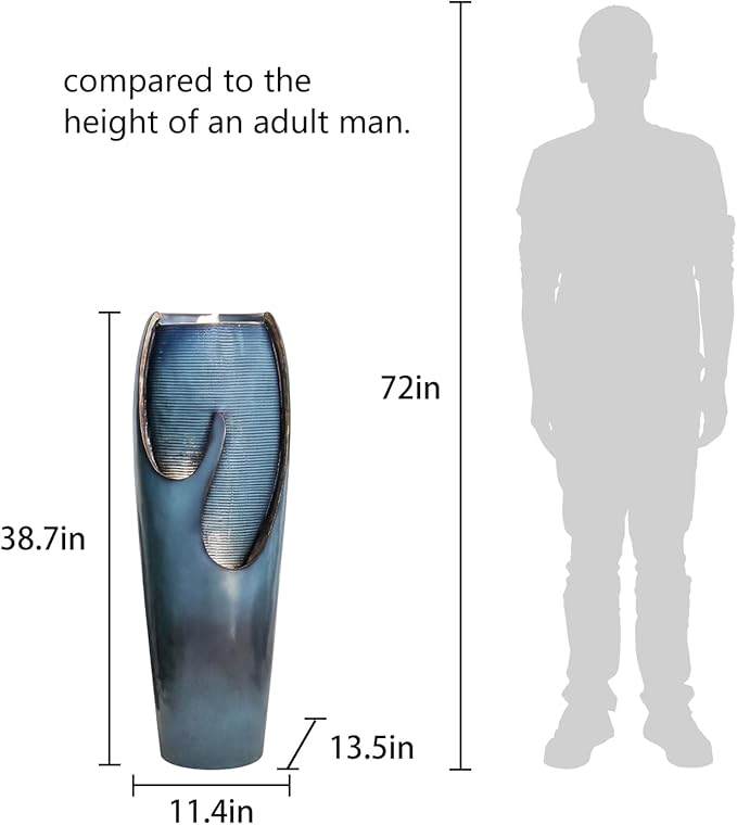 • With the suitable size 13.5" L x 11.4" W x 38.7" H for indoor or outdoor décor. The modern cascading Jar water fountain will add instant beauty to your surroundings.