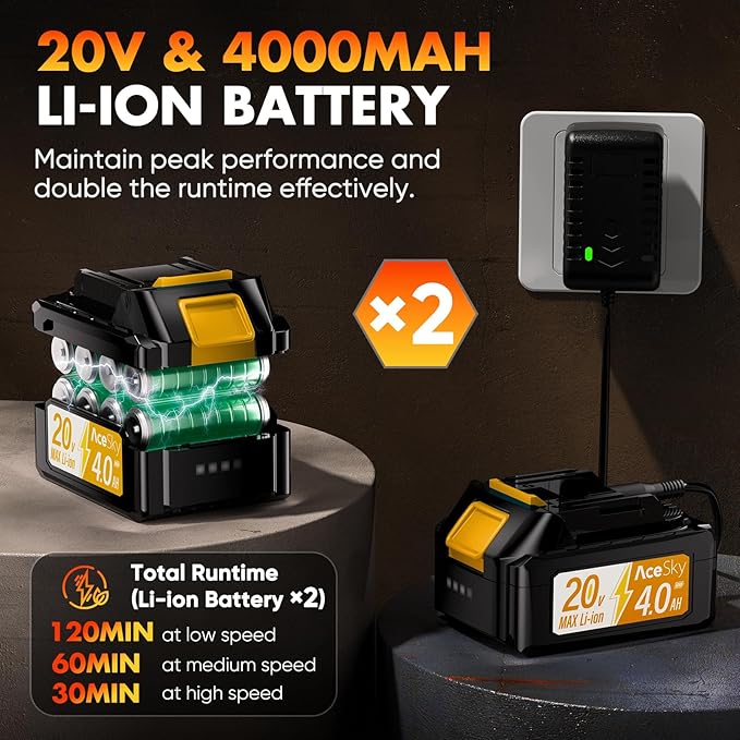 - ๐ใ2*4.0AH & 20V Lithium BatteriesใOur cordless leaf blower is equipped with Dual 4.0AH lithium batteries, providing up to 120 minutes of runtime in low-speed mode and 30 minutes in high-speed mode. A convenient battery indicator (25%-50%-75%-100%) lets you monitor remaining power and charging progress with ease. Plus, the built-in protection system automatically shuts off the motor and battery, extending their lifespan and ensuring safe,continuous performance for all your outdoor cleaning needs