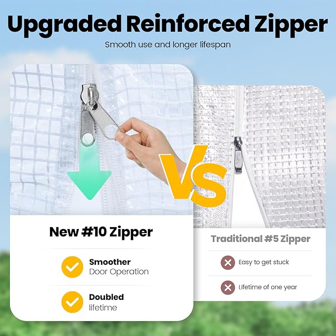 • [UVI 6 Protected Cover]--Our leading waterproof, UV Index 6 protected, and 150g/sqm PE grid cover protects your plants from excess rays, which doubles the service life: Compared to other greenhouse(UVI 1-3) that only lasts for 1-6 months, our KING-cover lasts for over years. The reinforced odorless PE covering material provides safe work zone. The cover fits the frame closely, enhancing warmth and wind resistance.