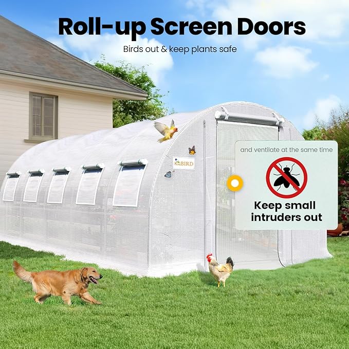 • [Temperature & Humidity Control]--Featured with 8 roll-up screen windows plus 2 door-netting, temperature and humidity can be well-controlled, which increases temperature promoting early spring plant growth, enhances ventilation on hot summer days, and retains warmth during the winter. It keeps plants from pouring rains, winds, and snows.