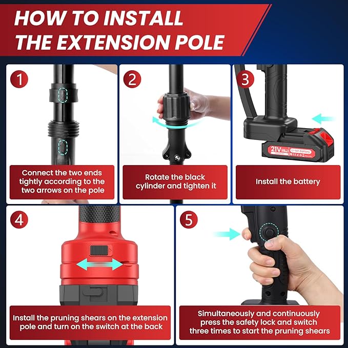 - ๐ฅใSmart Safety ProtectionใSafety first. The electric pruner features a safety lock that requires you to press the start button 3-4 times until you hear a beep. This ensures the tool only works when you're ready. The safety lock feature allows worry-free work and prevents accidental activation.