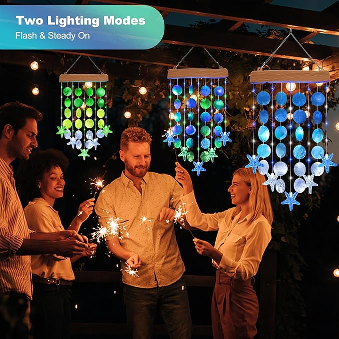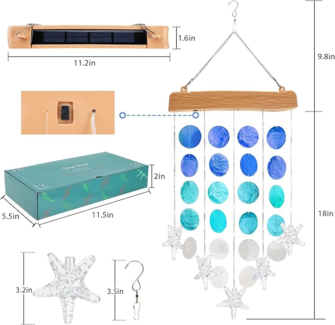 - ๐UNIQUE DESIGNED OUTDOOR DECOR - This shell wind chimes with starfish is not just a decoration, it's a work of art. Combining solar lights with handmade white & blue sea shells, it stands out from all other decorative mobile lights on the market. It brings a calming and tranquil atmosphere to your home during the day and night. Use it to decorate your home, patio, porch, or as hanging decor. It's nice for meditation or simply relaxing indoor and outdoors