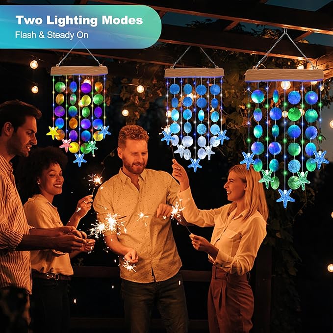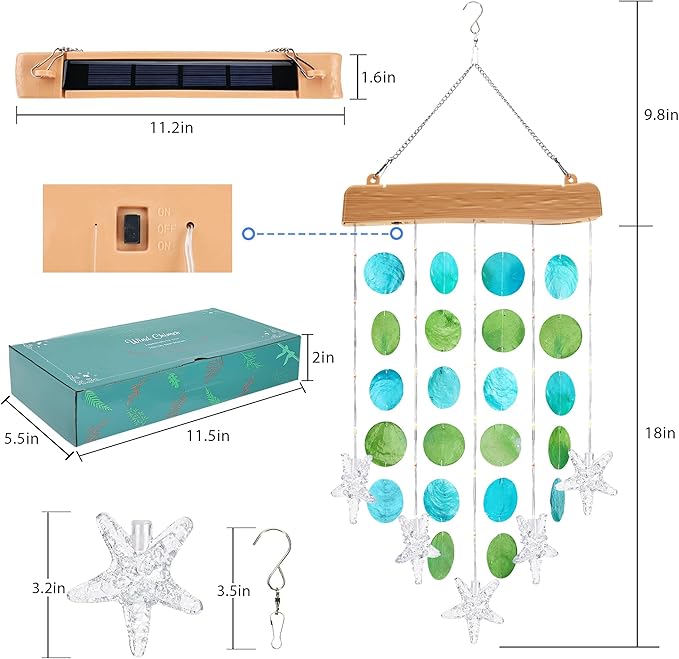 - ๐UNIQUE DESIGNED OUTDOOR DECOR - This shell wind chimes with starfish is not just a decoration, it's a work of art. Combining solar lights with handmade blue & green sea shells, it stands out from all other decorative mobile lights on the market. It brings a calming and tranquil atmosphere to your home during the day and night. Use it to decorate your home, patio, porch, or as hanging decor. It's nice for meditation or simply relaxing indoor and outdoors