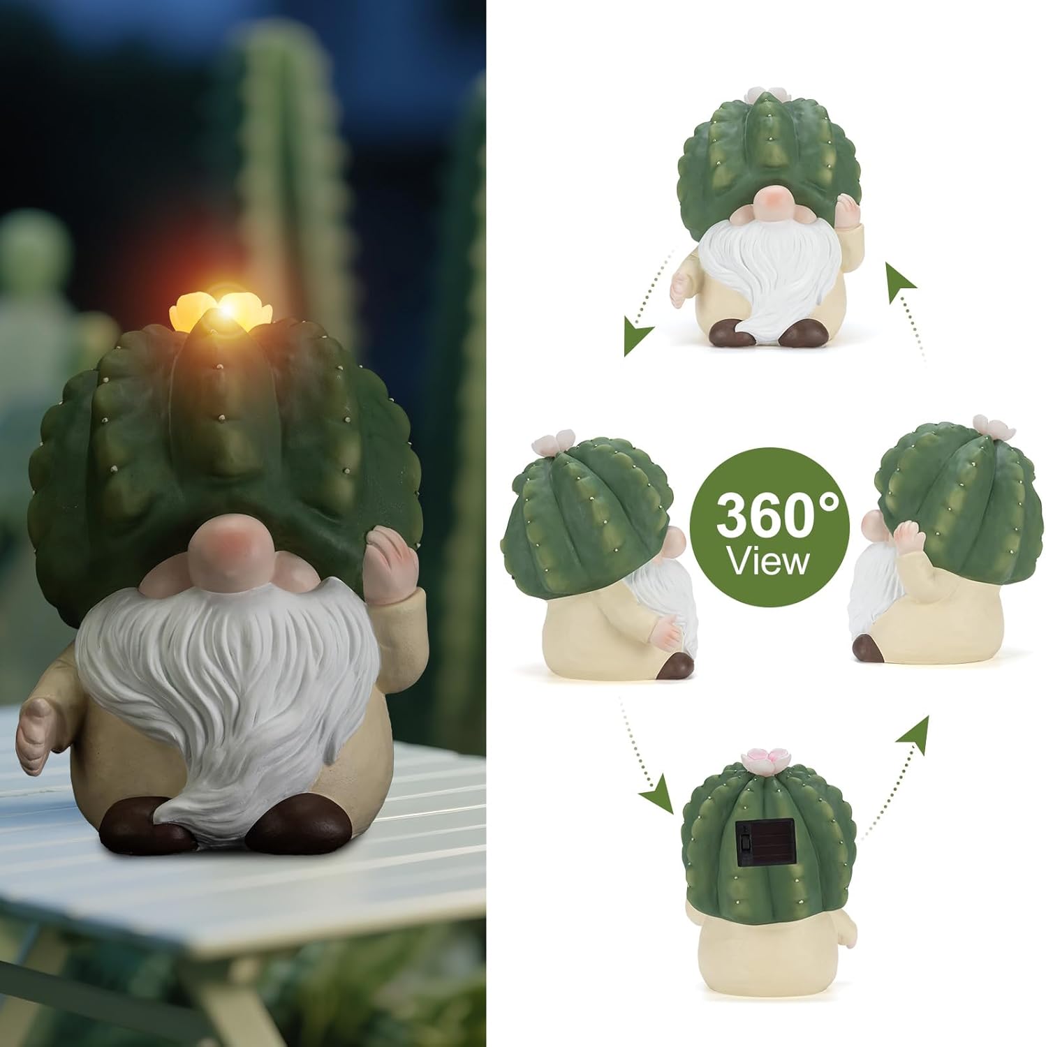 Solar Cactus Gnome Statue Garden Decor Light - Outdoor Decorative LED Flower, Suitable for Patio, Lawnand Garden Decorations, Gifts for Mom