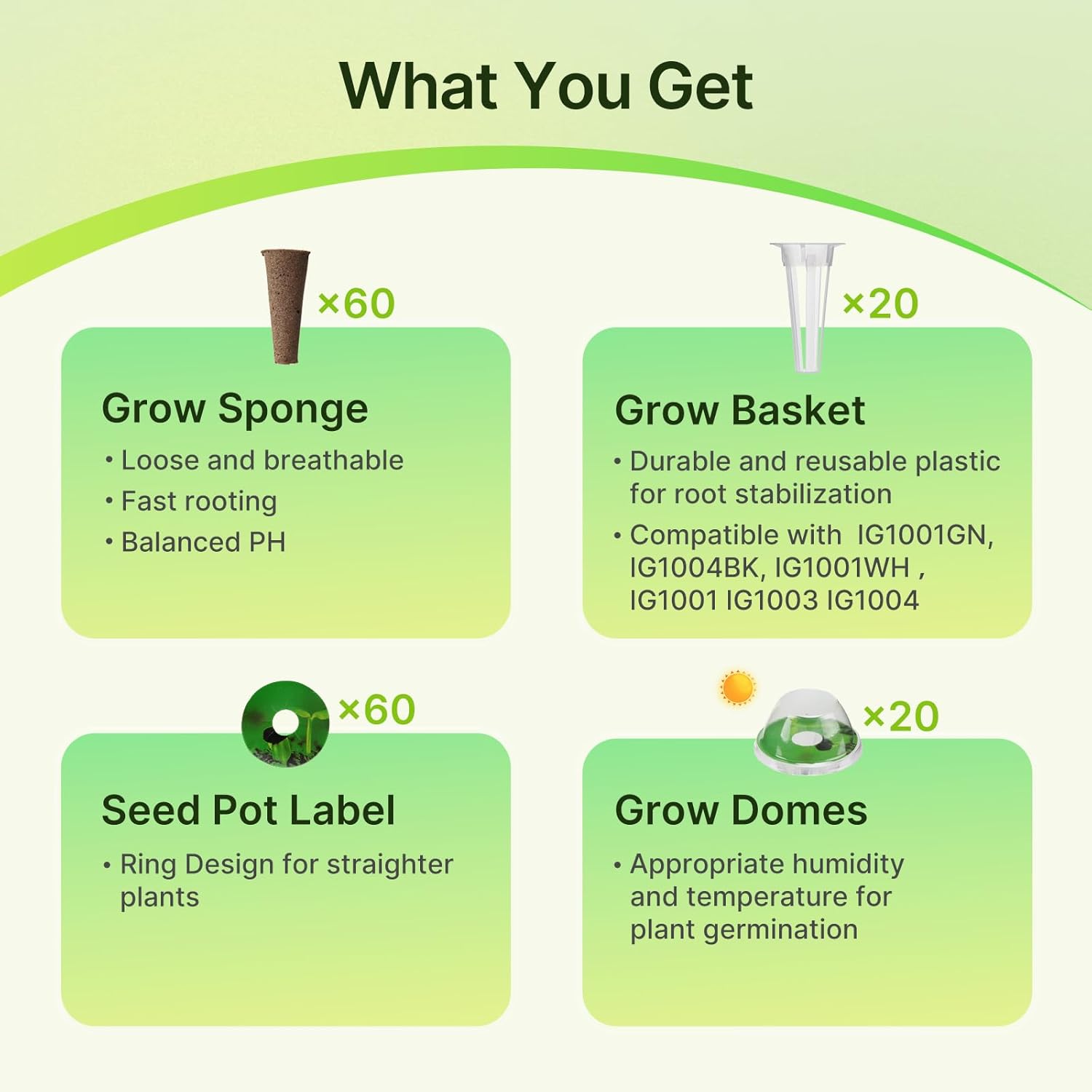 160pcs Hydroponic Pods, Accessories Compatible with Suncoze & Other Hydroponics Growing Systems, Gardening Supplies Garden Pods Include 60 Grow Sponges, 20 Grow Baskets, 20 Domes, 60 Labels