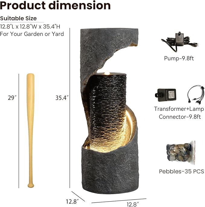 • Size and Package: 12.8 "L X 12.8 "W X 35.4 "H. Package includes: garden fountains outdoor *1 (20 lbs), transformer *1, adjustable water pump *1, pebble pack *1, instruction manual *1.